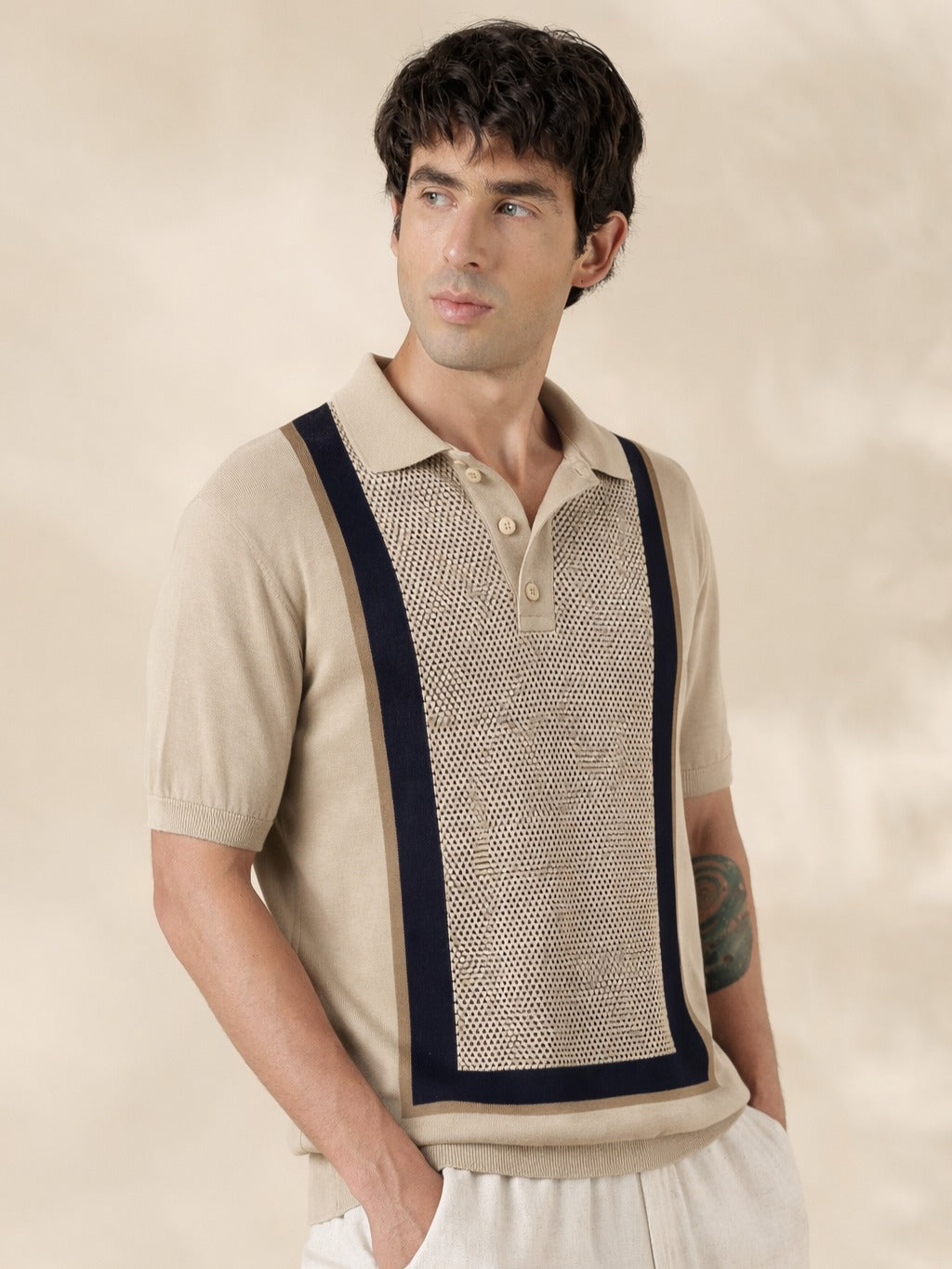 Navy Color Block Slim Fit Polo Collar Flat Knit T-Shirt