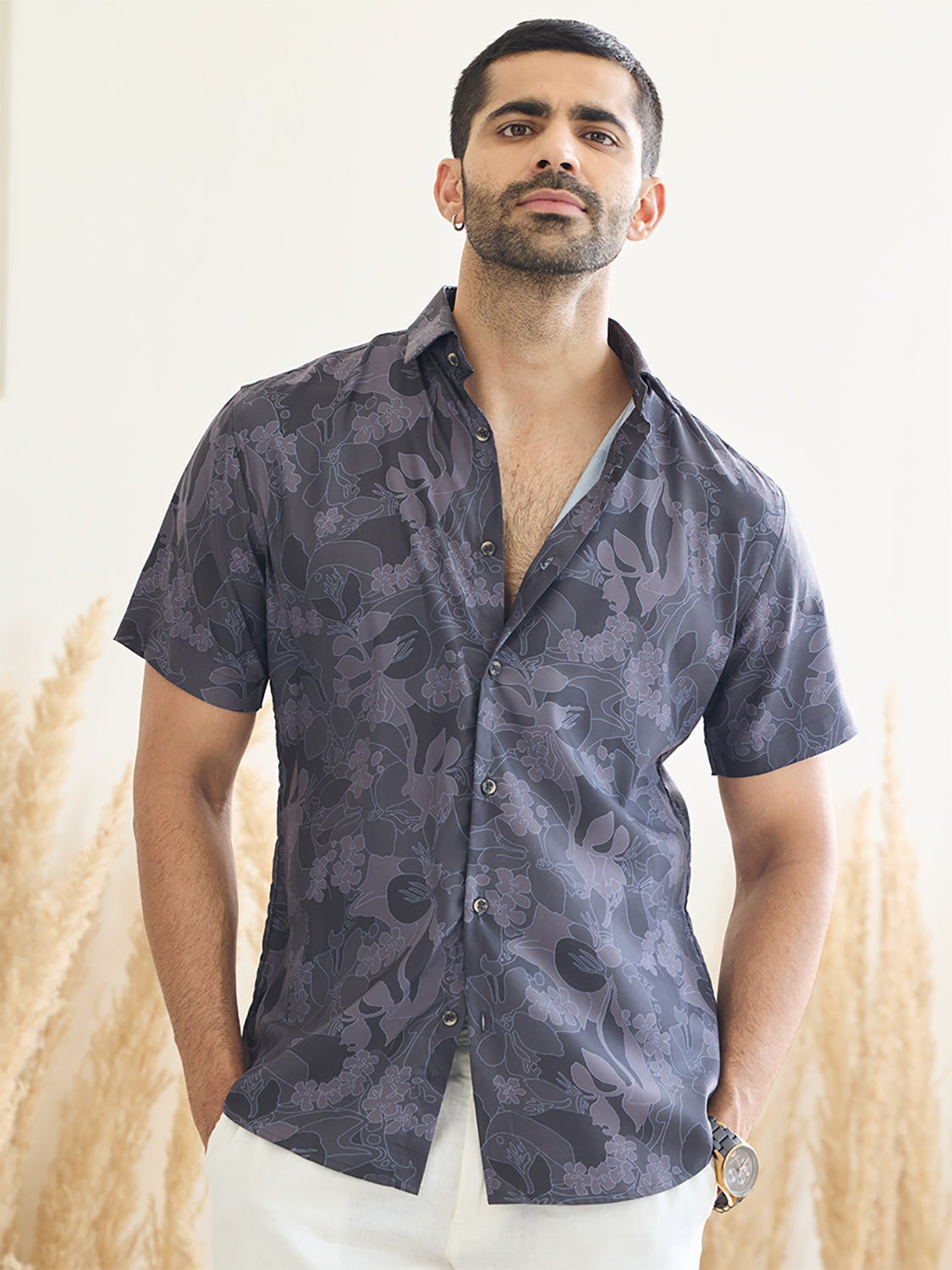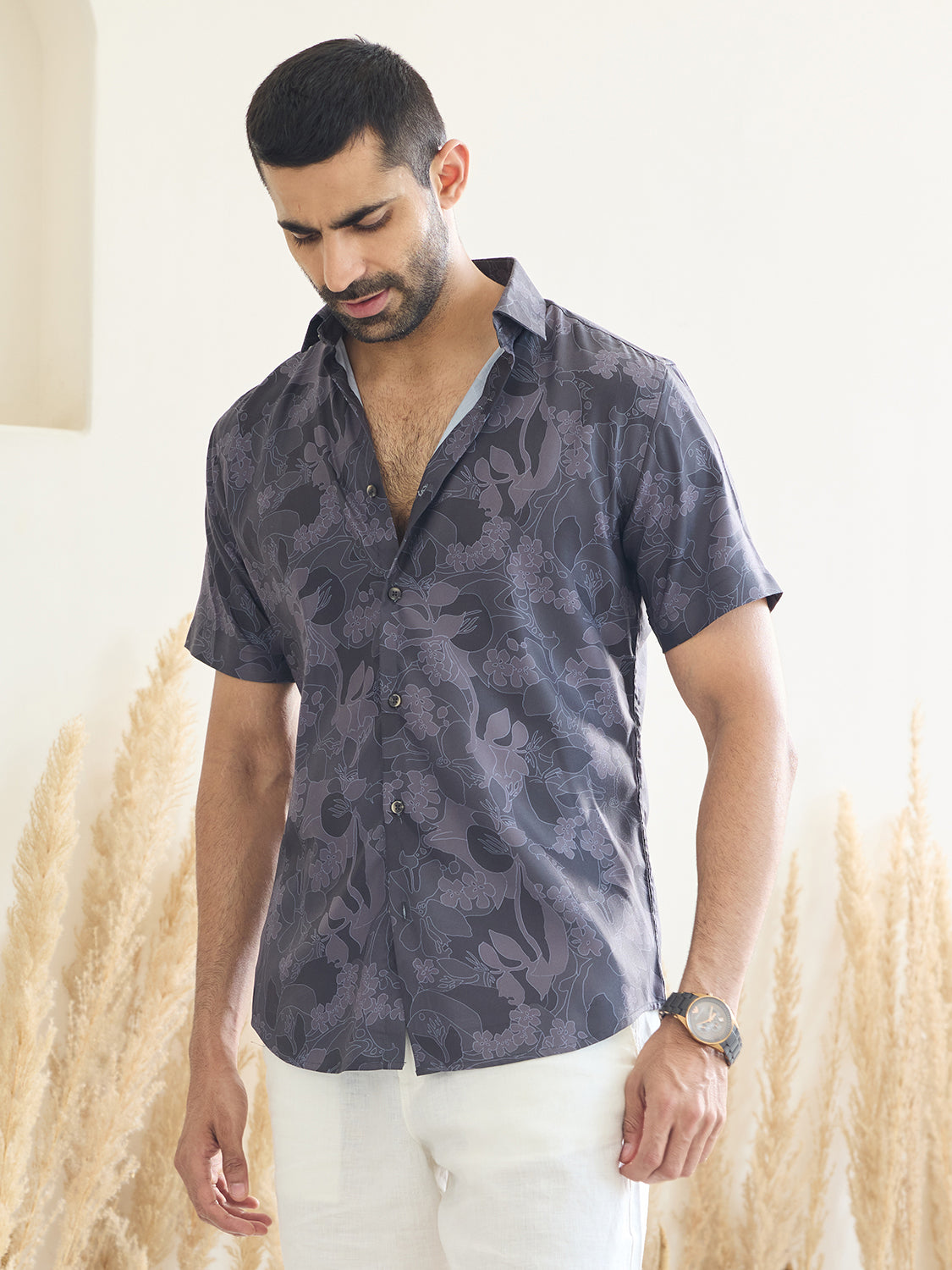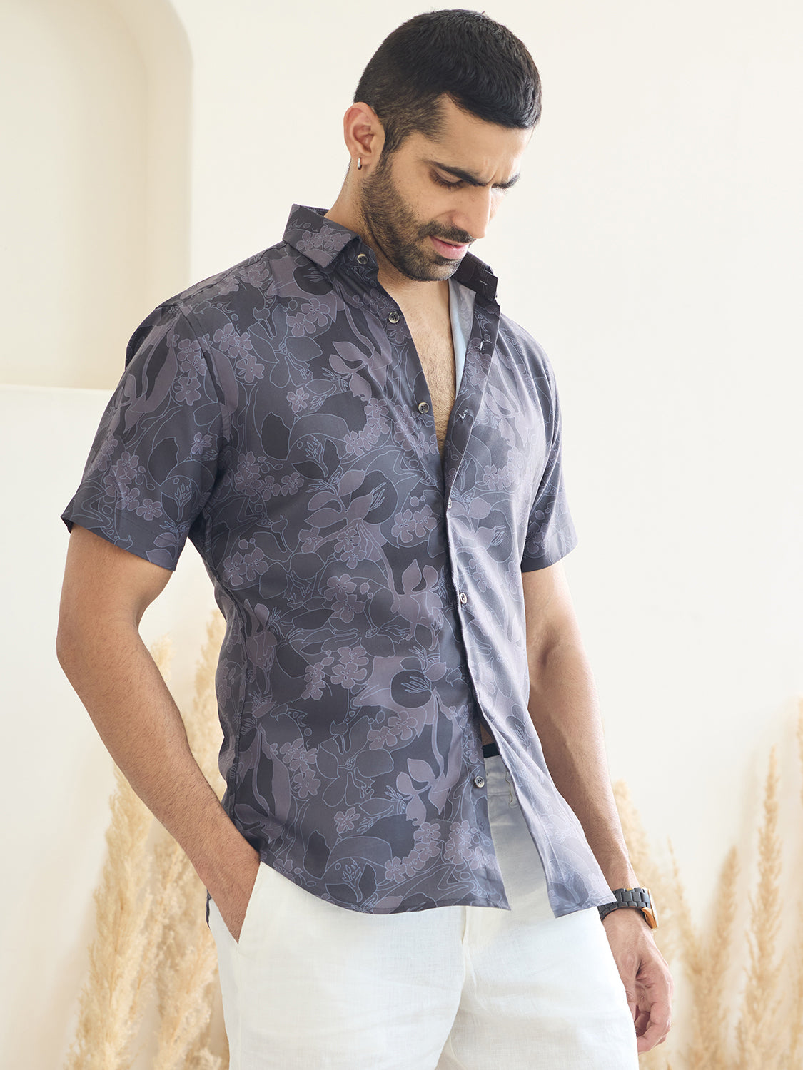 Unveil sophistication with our Grey Printed Shirt, boasting a refined floral leafy design. Tailored from resilient twill poly-lycra fabric, this half-sleeved shirt marries elegance with durability. Whether gracing an evening gala or commanding attention in the boardroom, its desert mirage vibe exudes an aura of cultivated charm, making it a quintessential choice for the modern gentleman's formal repertoire.