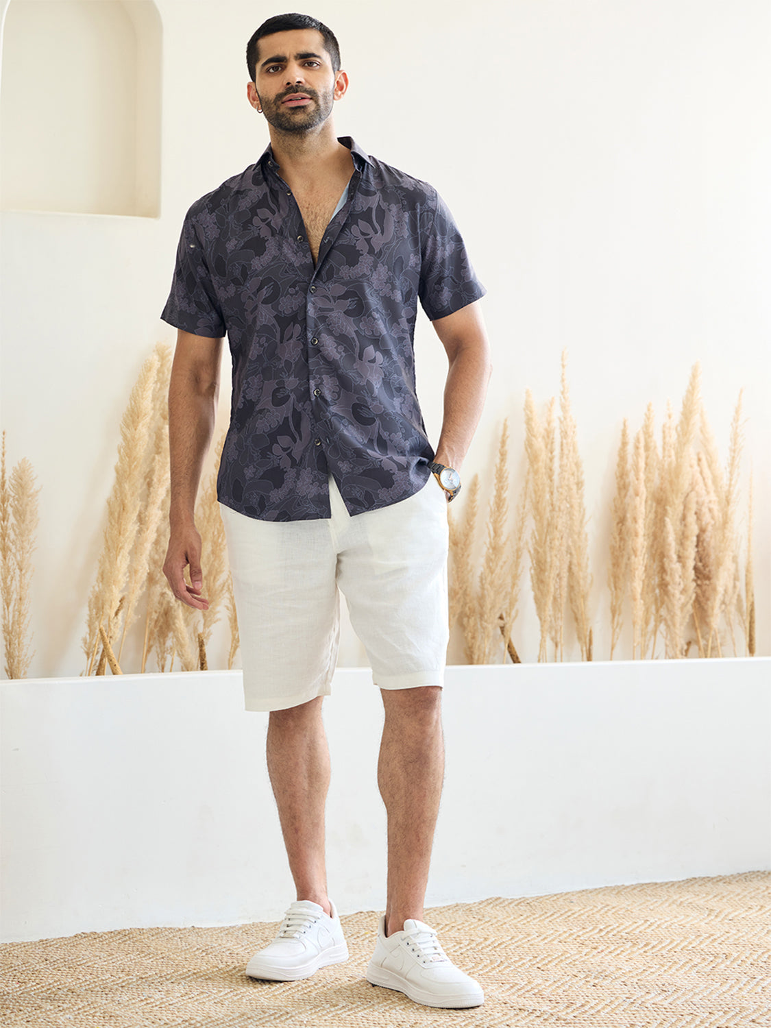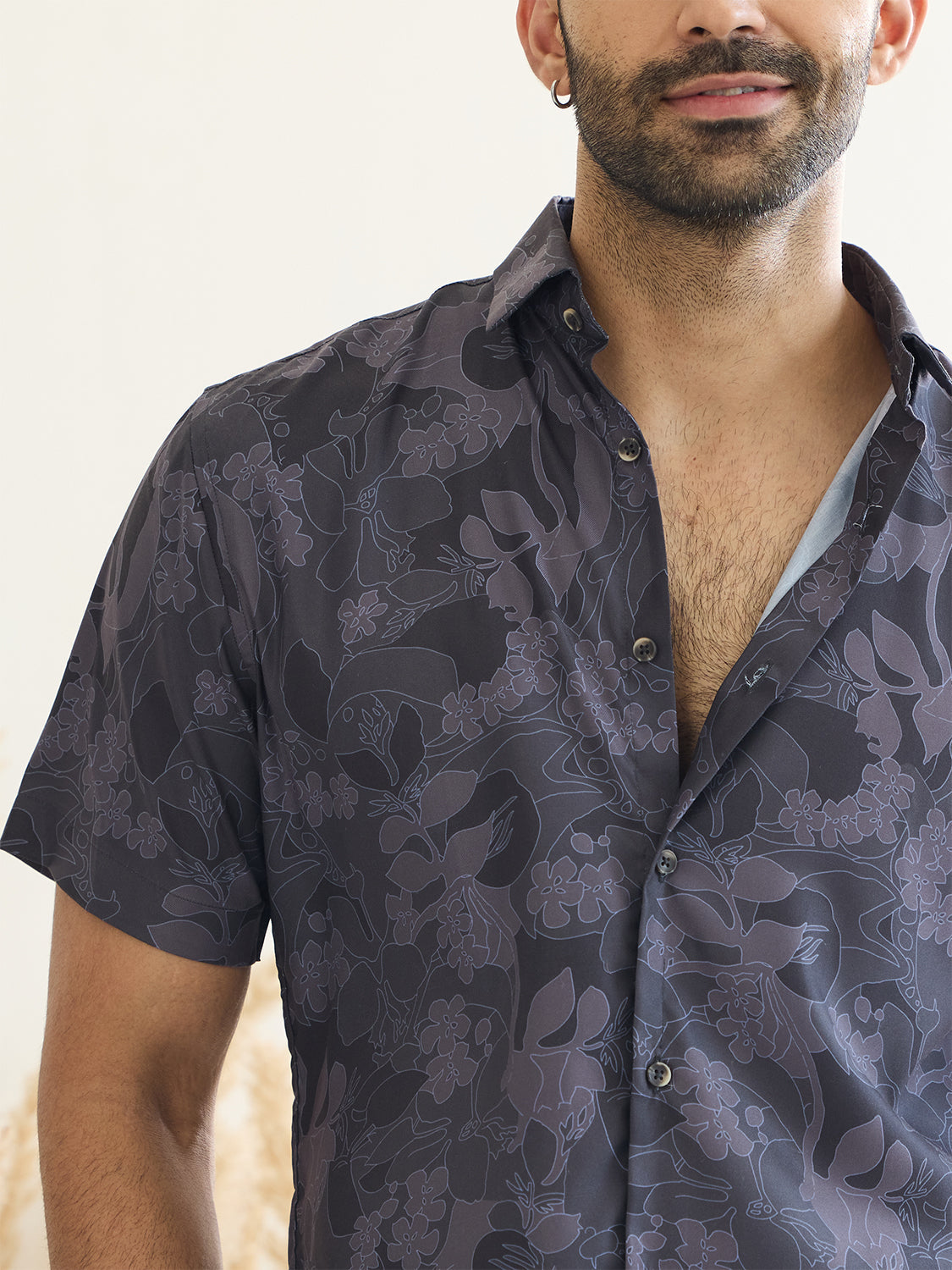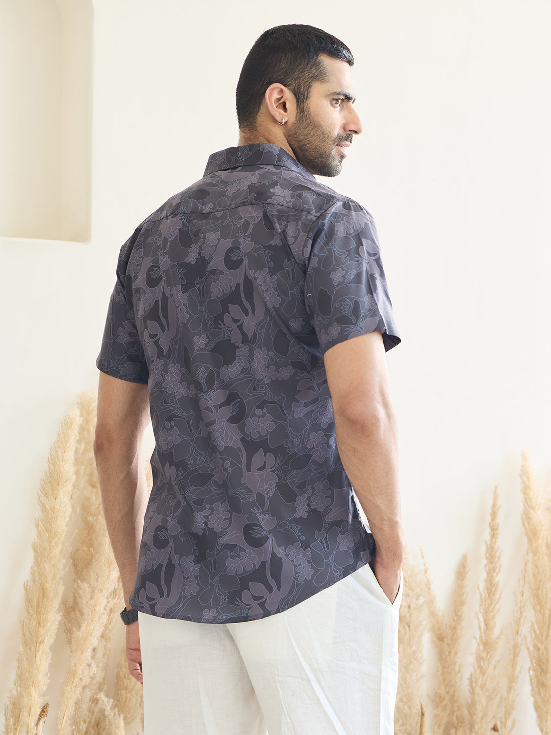 Unveil sophistication with our Grey Printed Shirt, boasting a refined floral leafy design. Tailored from resilient twill poly-lycra fabric, this half-sleeved shirt marries elegance with durability. Whether gracing an evening gala or commanding attention in the boardroom, its desert mirage vibe exudes an aura of cultivated charm, making it a quintessential choice for the modern gentleman's formal repertoire.