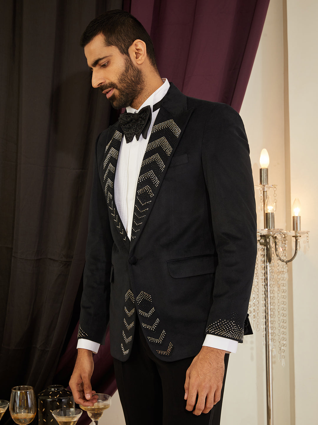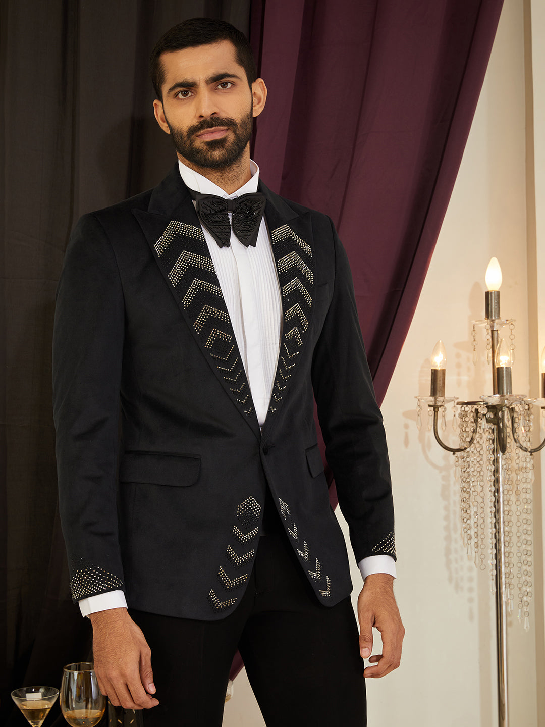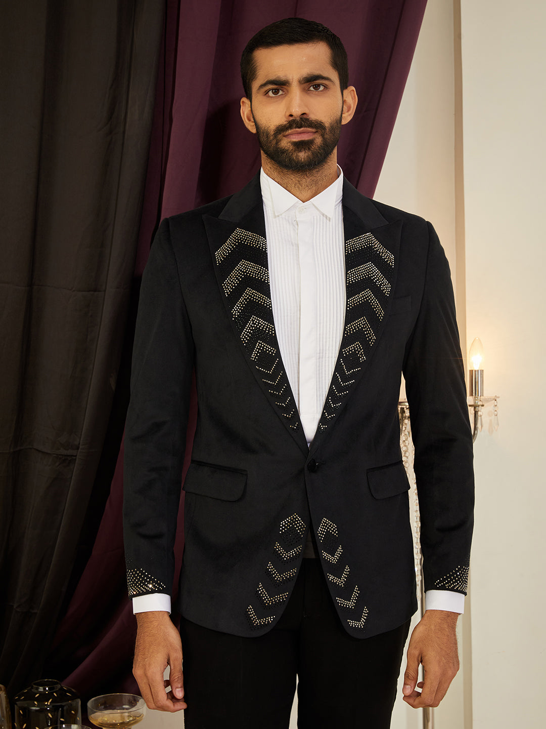 Sparkling rhinestones adorn a plush velvet blazer, catching light from every angle for standout party glam.
