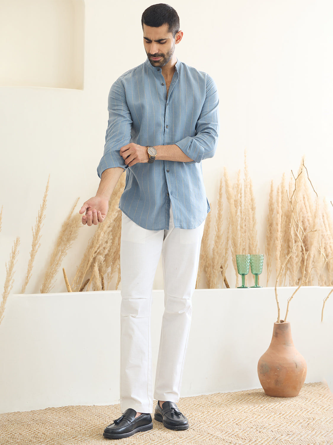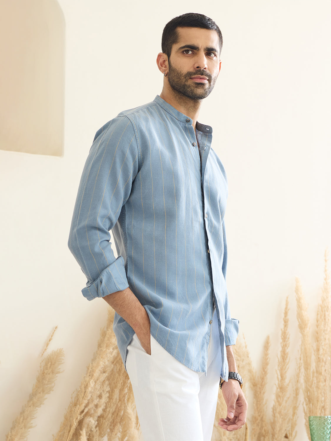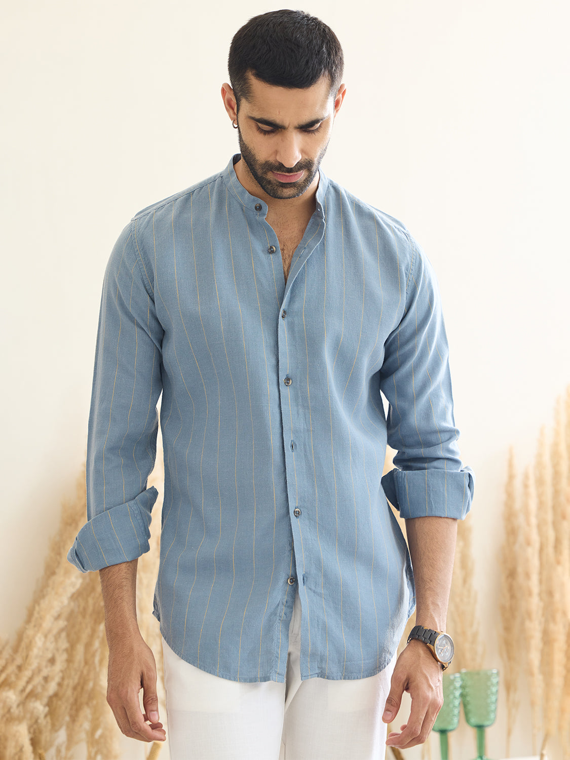 Make waves in your wardrobe with our Blue Stripe Full Sleeve Shirt, featuring a sleek band collar for a contemporary edge. Crafted in a slim fit, this shirt hugs your frame in all the right places, ensuring a tailored look that commands attention. Perfect for smart casual occasions, the vibrant stripes add personality to your ensemble, making it a versatile staple for every modern gentleman.