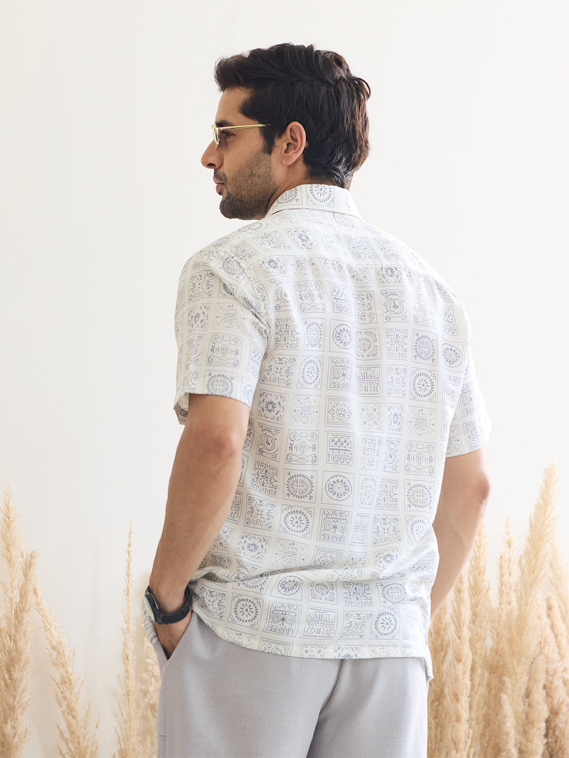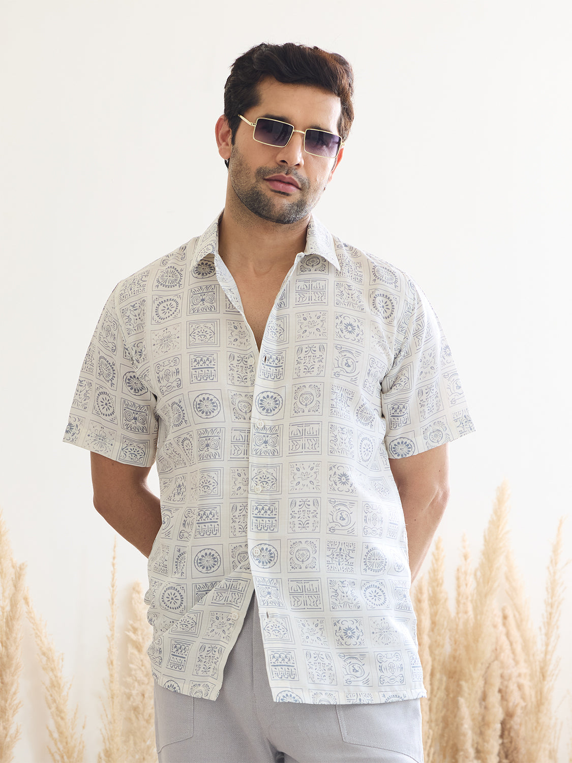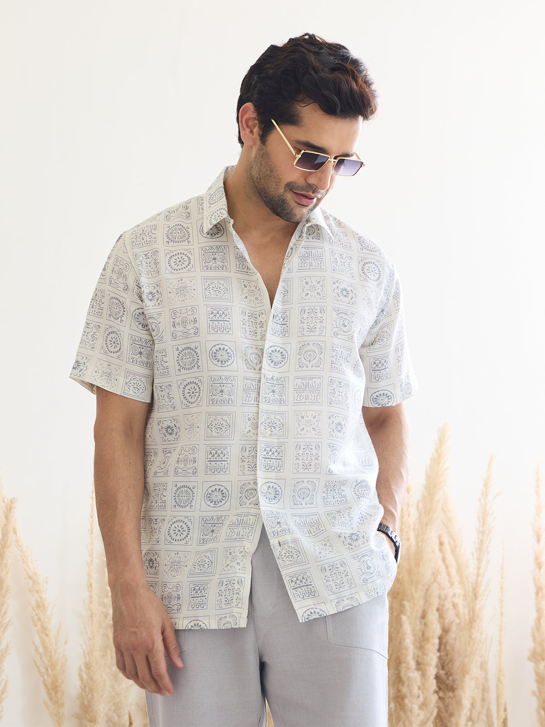 Introducing our White Printed Shirt with Ivory Color Print, crafted from luxurious satin muslin for a tranquil vibe. Its half sleeves and relaxed fit offer a laid-back elegance, perfect for modern menswear looks. Embrace serenity and style effortlessly with this versatile piece.