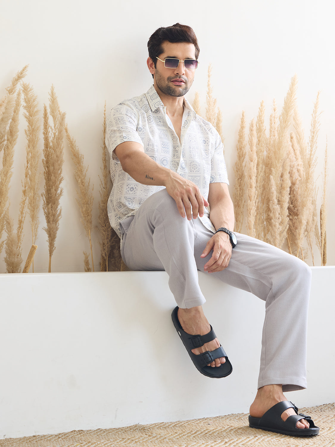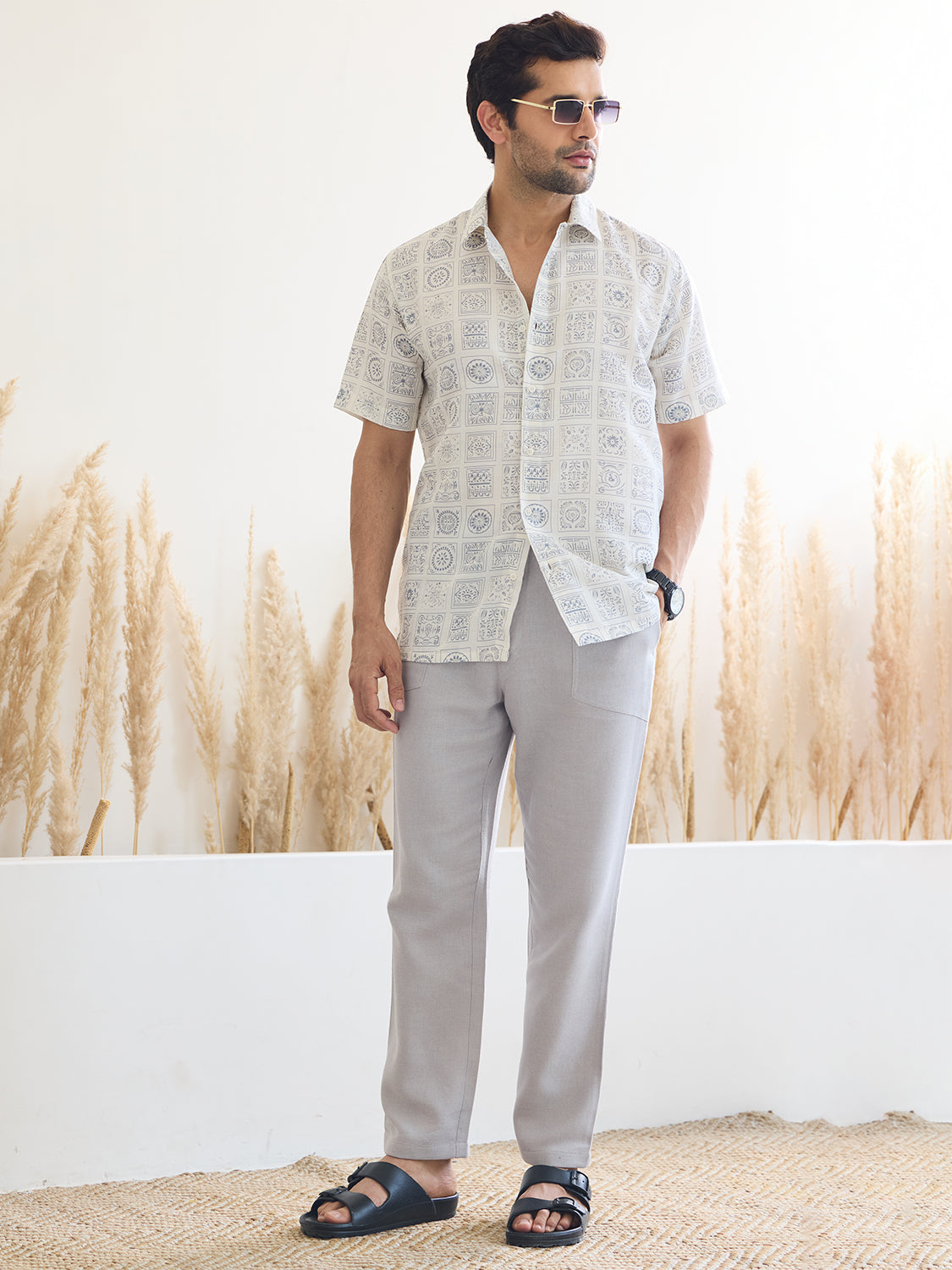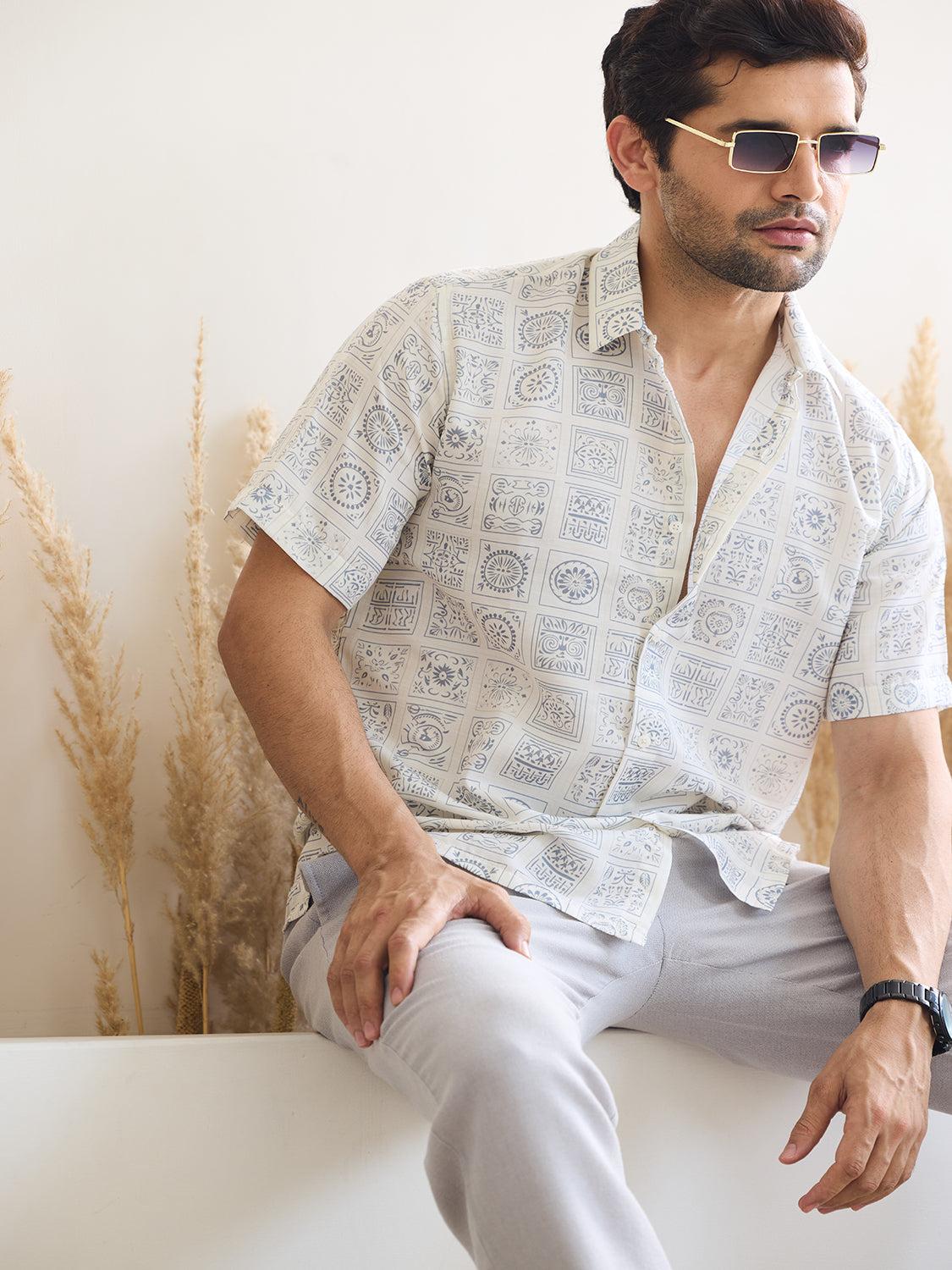 Introducing our White Printed Shirt with Ivory Color Print, crafted from luxurious satin muslin for a tranquil vibe. Its half sleeves and relaxed fit offer a laid-back elegance, perfect for modern menswear looks. Embrace serenity and style effortlessly with this versatile piece.