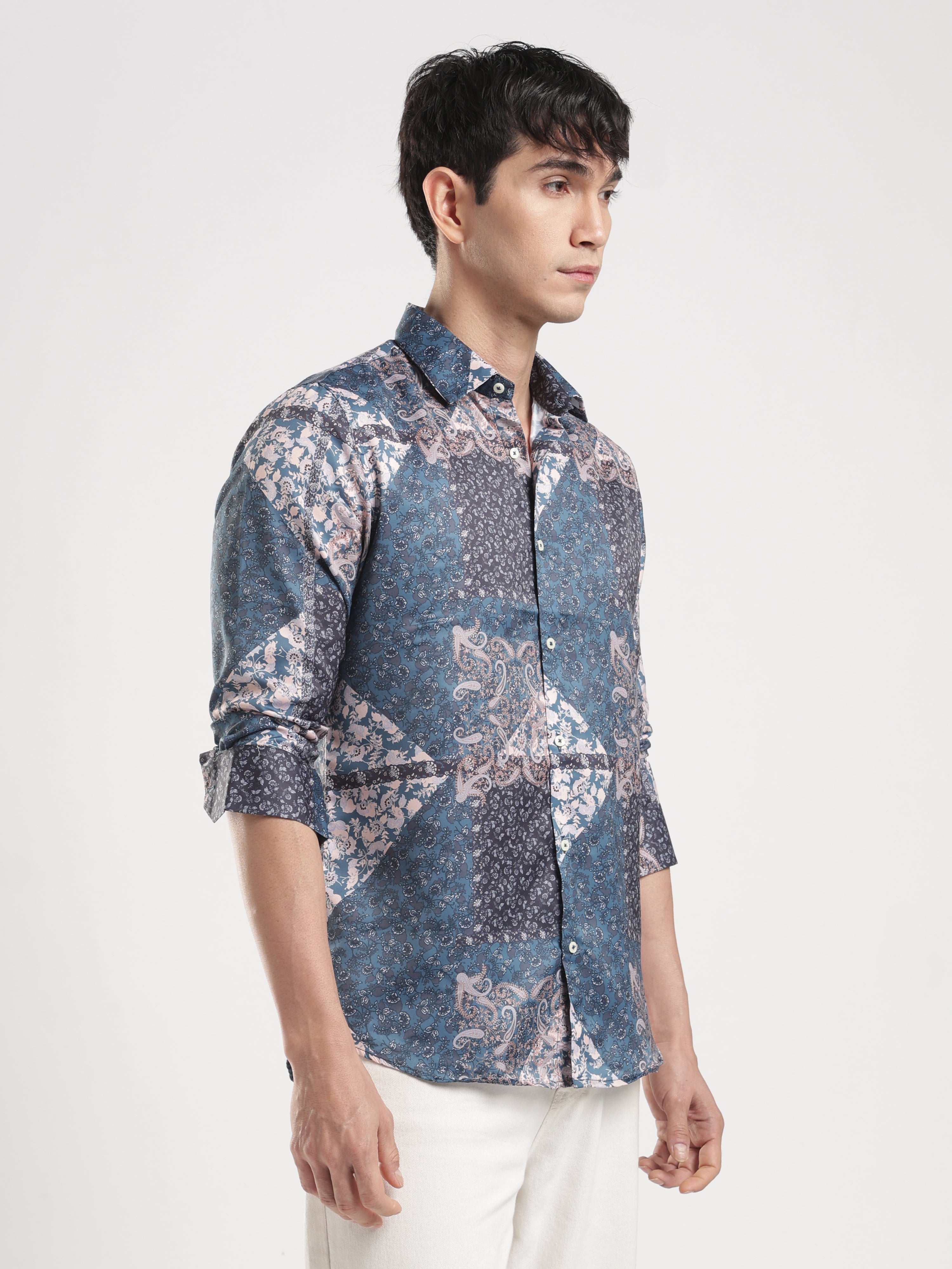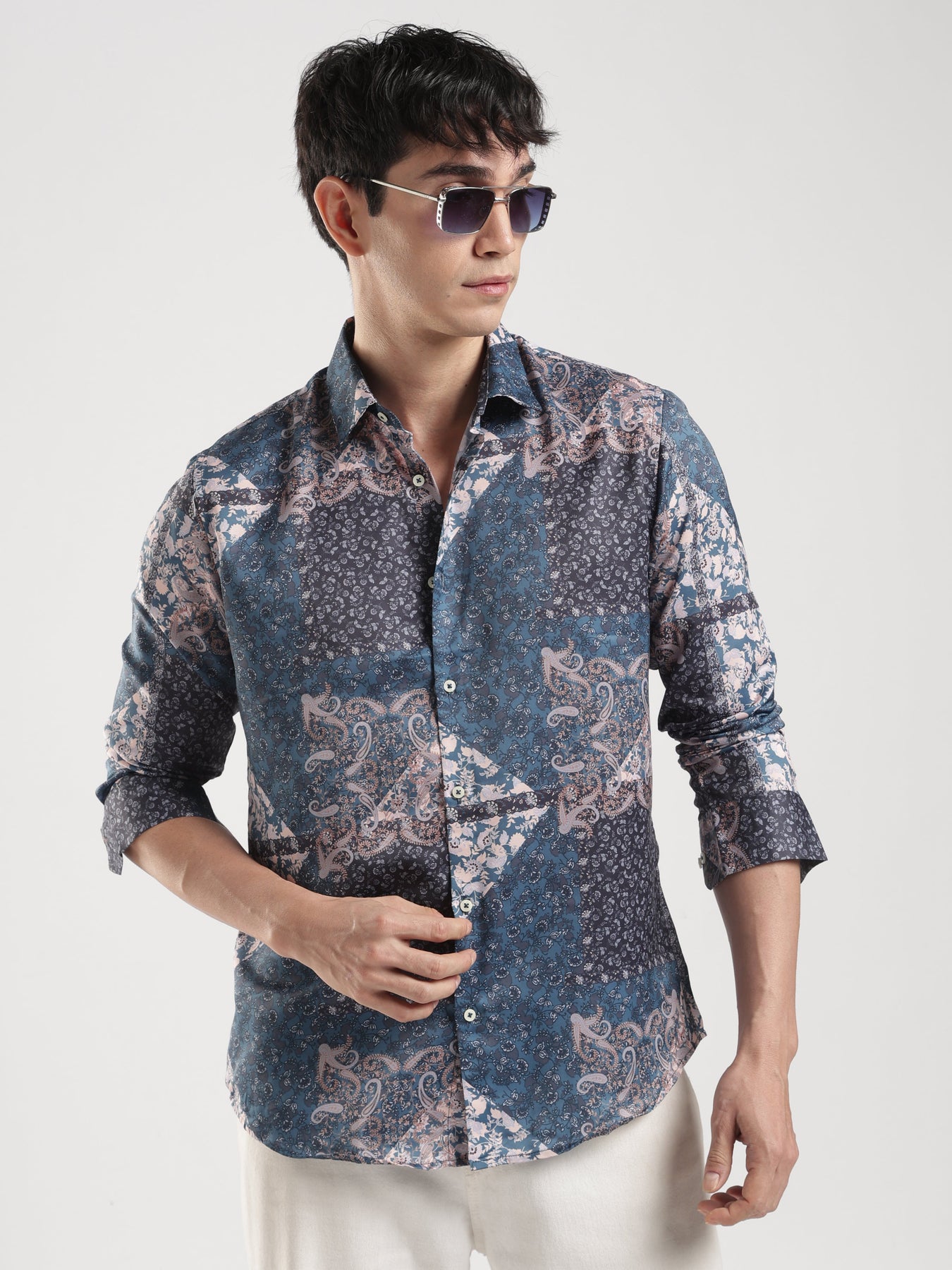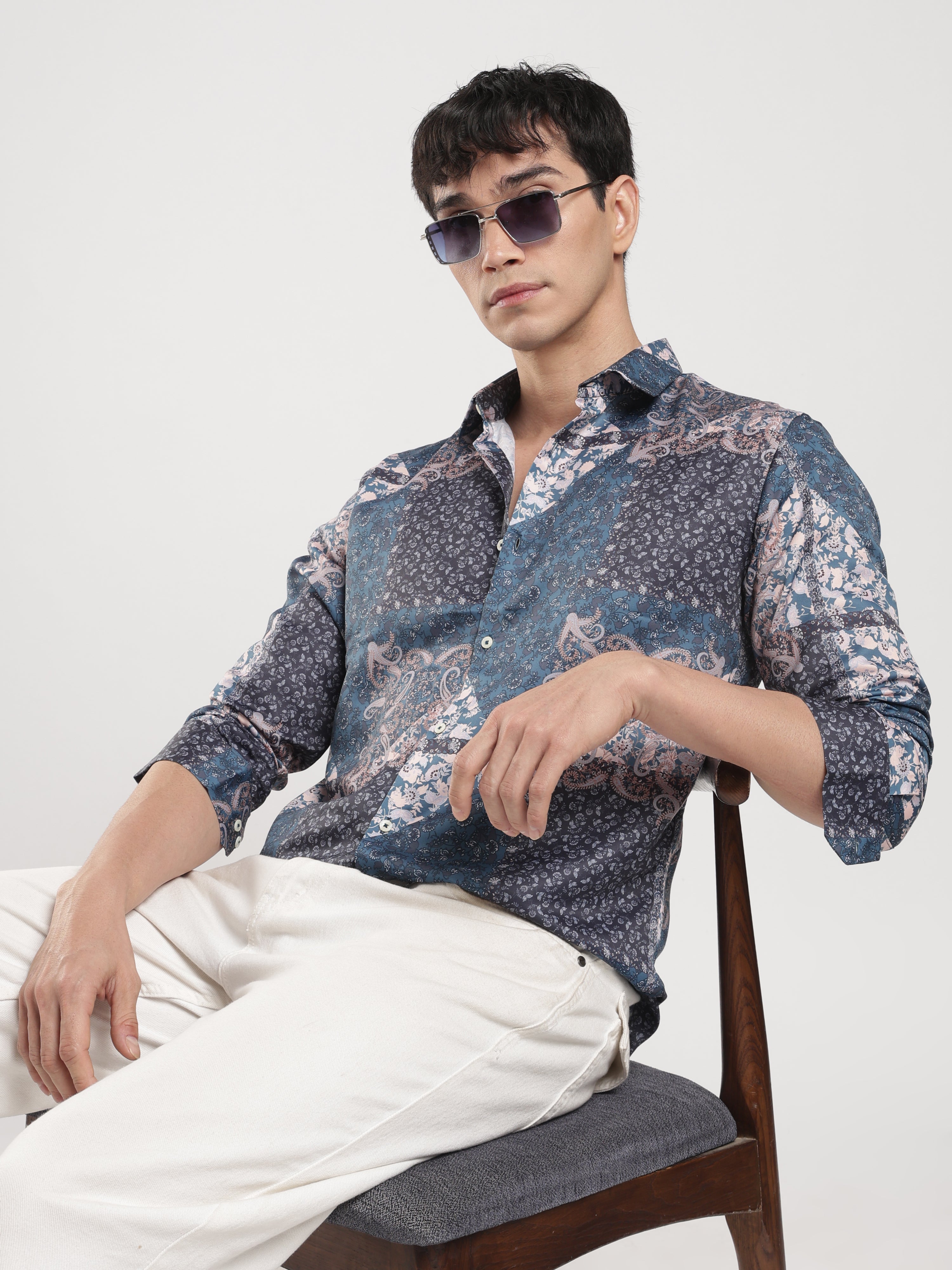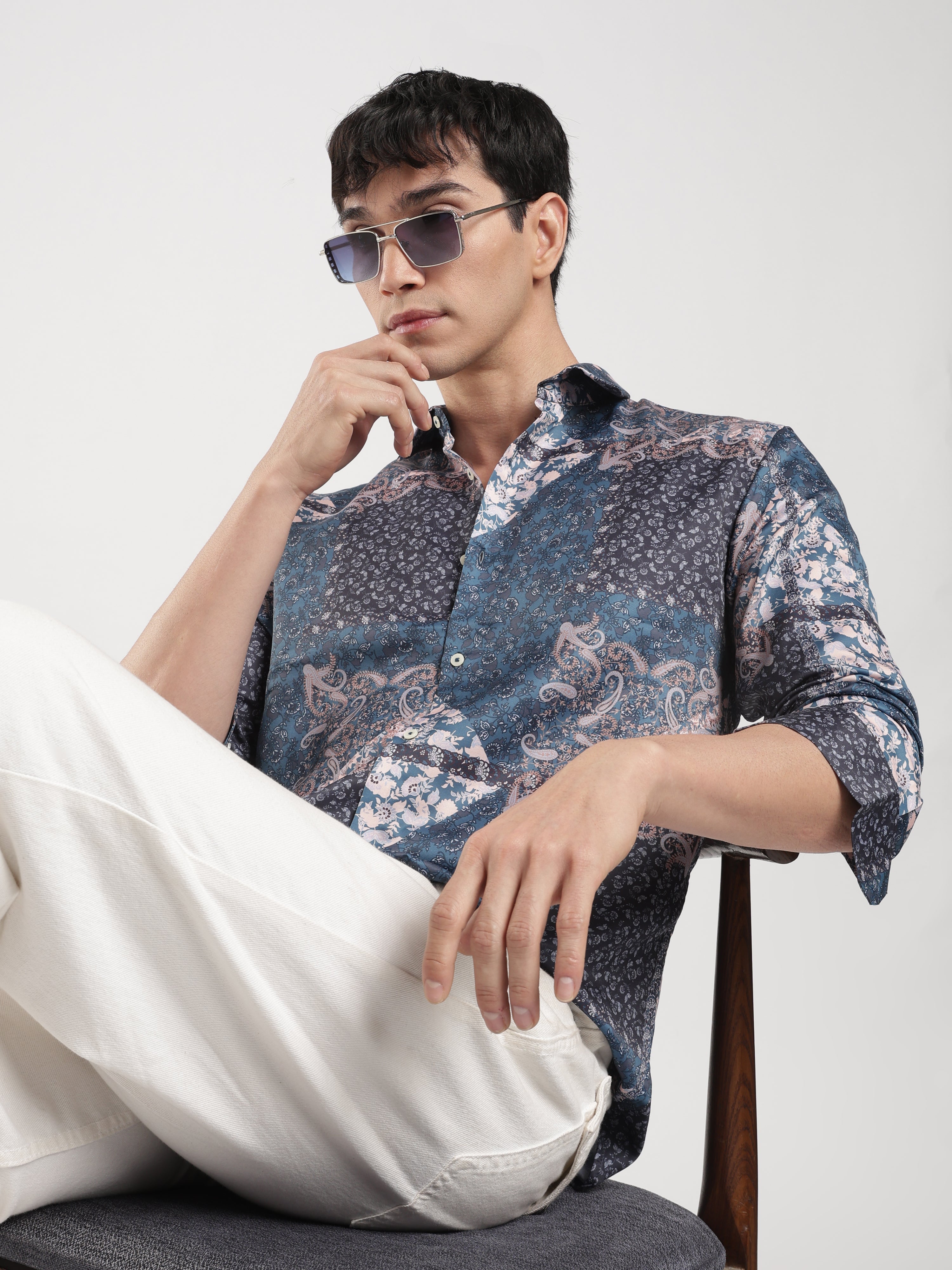 Catchy Customer Line: "Style That Moves, Fashion That Grooves: Feel the Beat with The Electric Boogie Shirt!" Elevate your style game with "The Electric Boogie Shirt," your ultimate smart casual companion. Crafted from luxurious Satin Muslin fabric, this Blue Color Printed Full Sleeve Shirt offers a tailored slim fit and a sophisticated spread collar. With its dynamic print and impeccable craftsmanship, it's the perfect choice for making a lasting impression. Turn heads and light up the night with "The Electric Boogie Shirt."