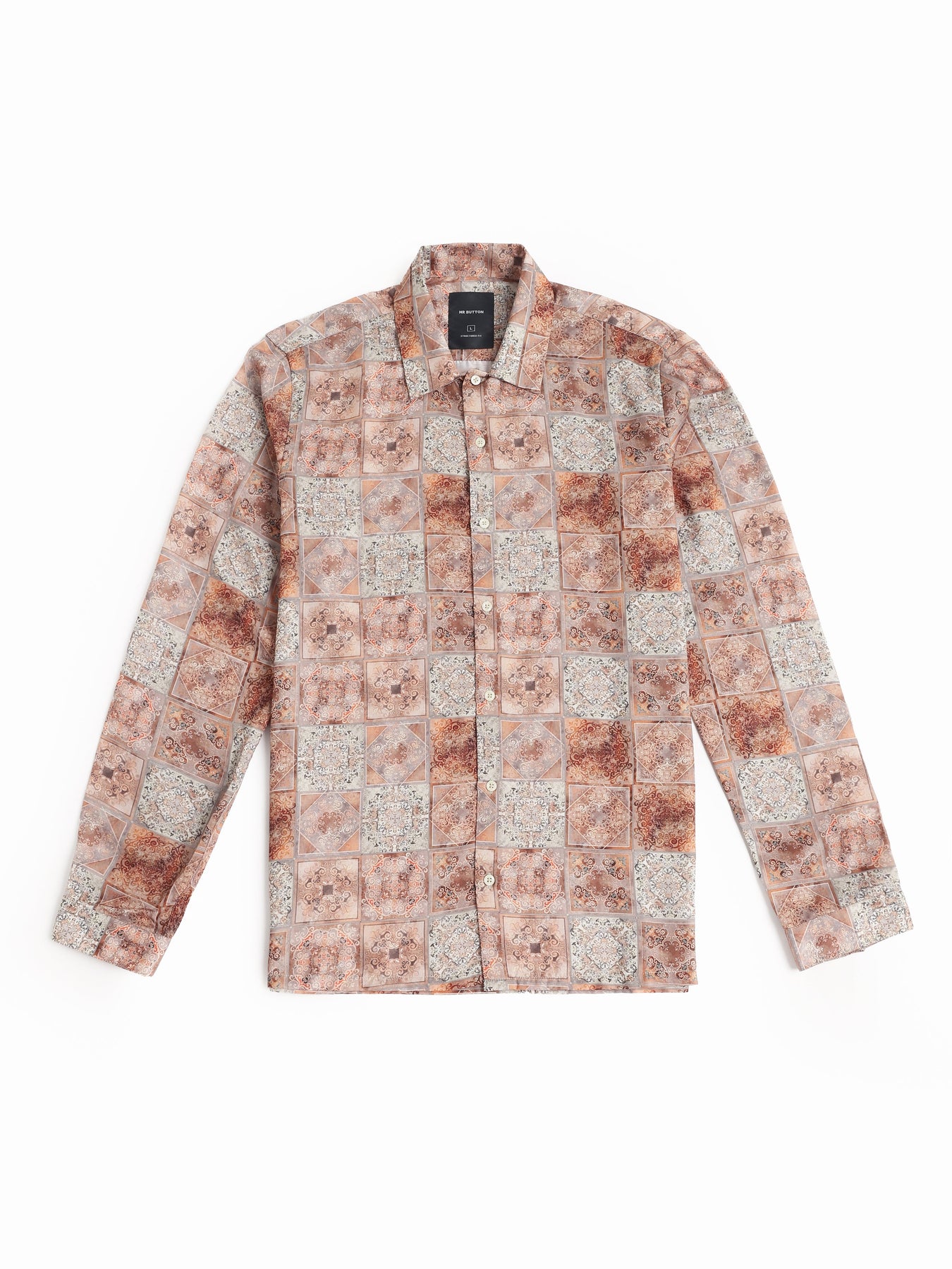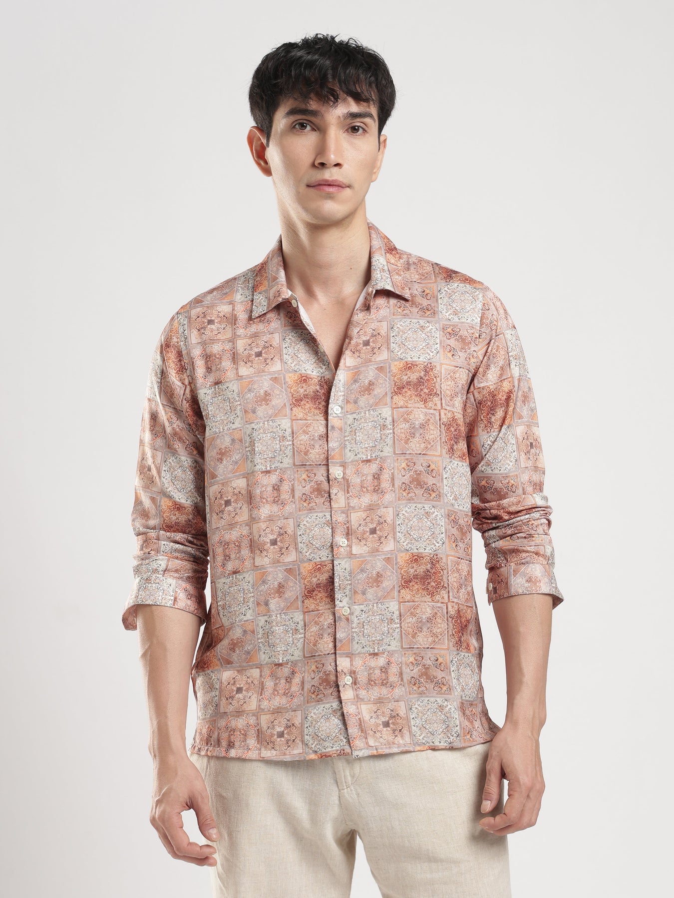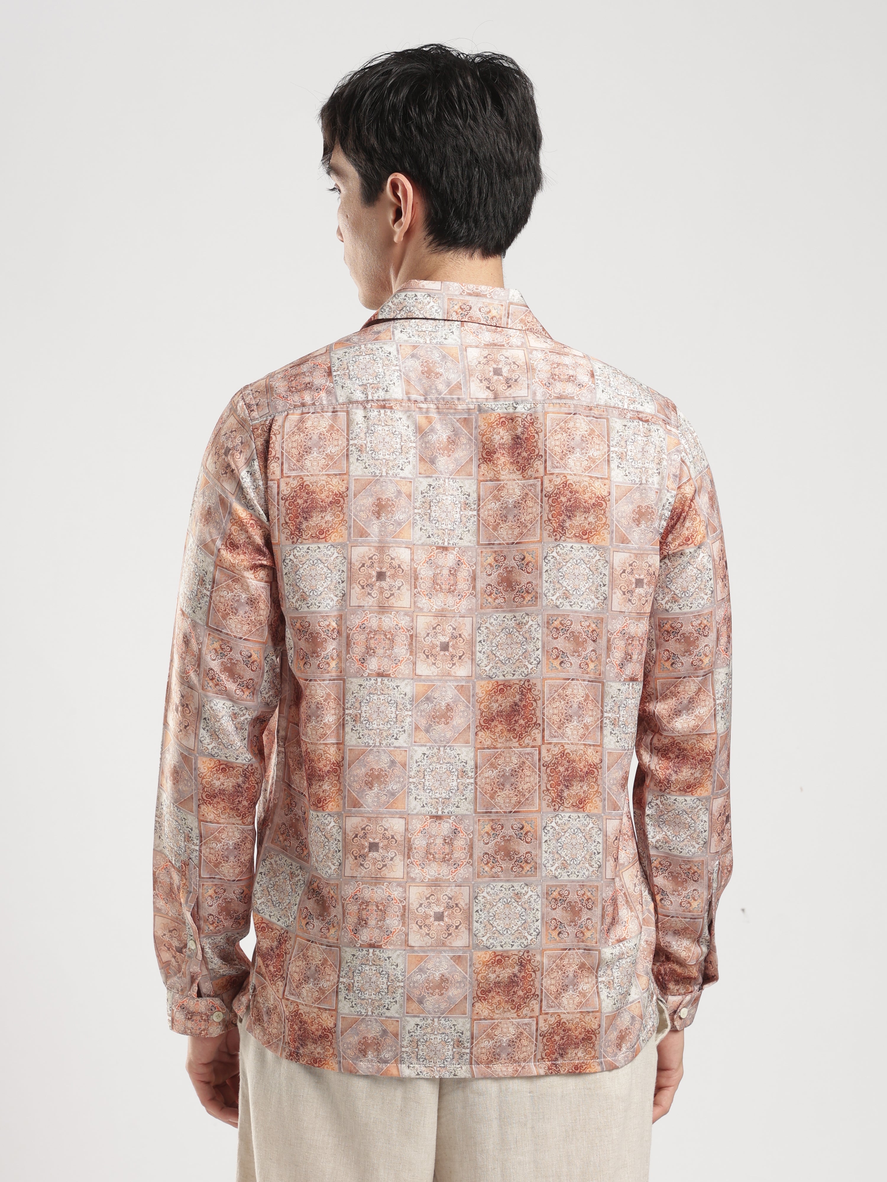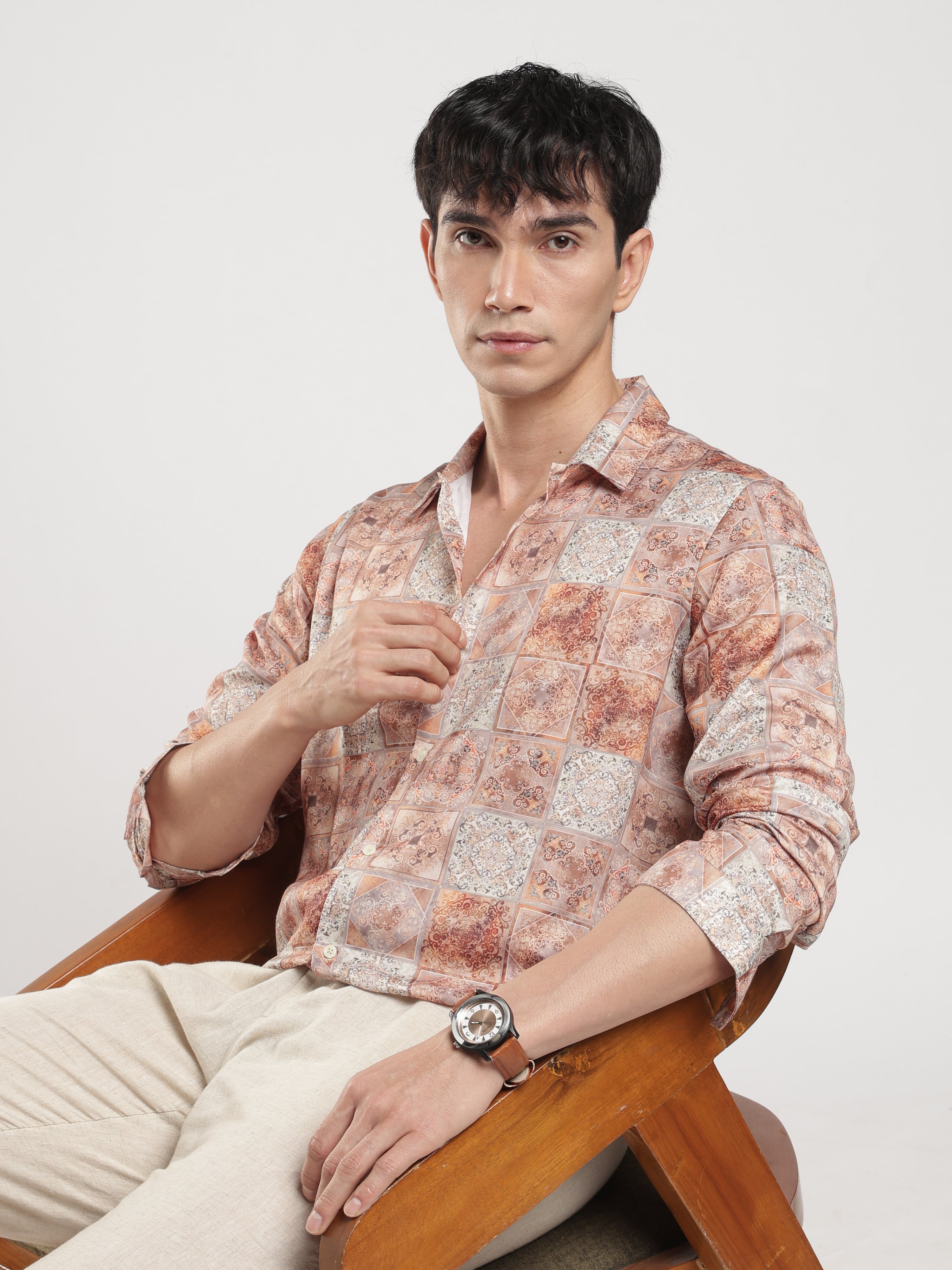 Unveil sophistication with our Beige Printed Shirt, adorned with intricate brickish printing. Crafted from satin muslin in a slim fit design, this full-sleeve shirt radiates smart casual charm. Its unique pattern adds a contemporary edge, perfect for making a statement at any gathering. Embrace urban elegance and elevate your style effortlessly.