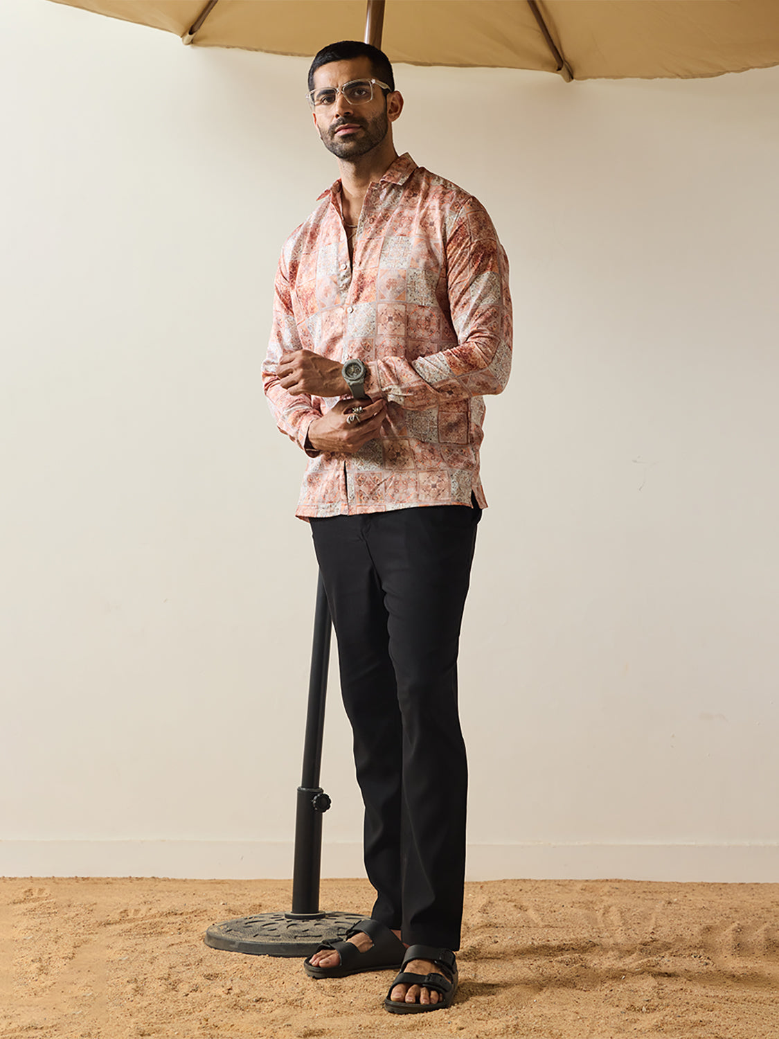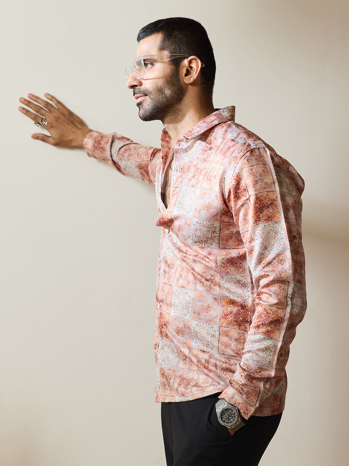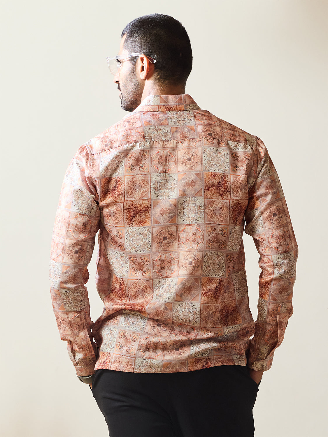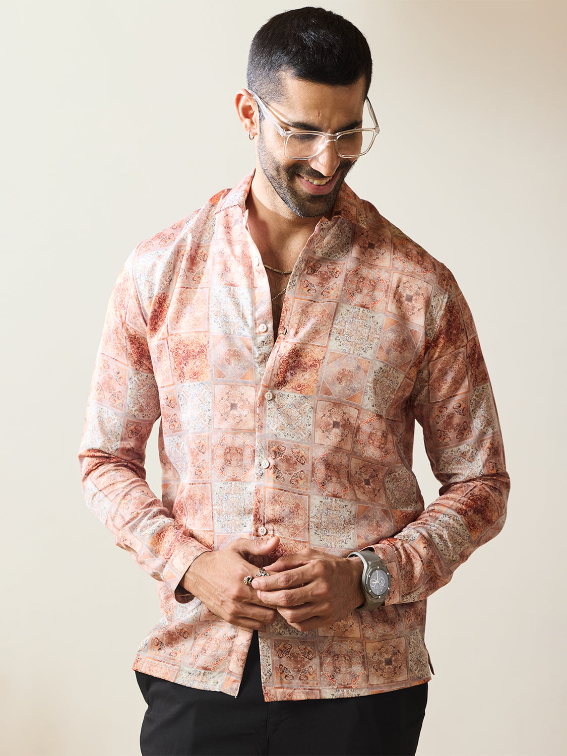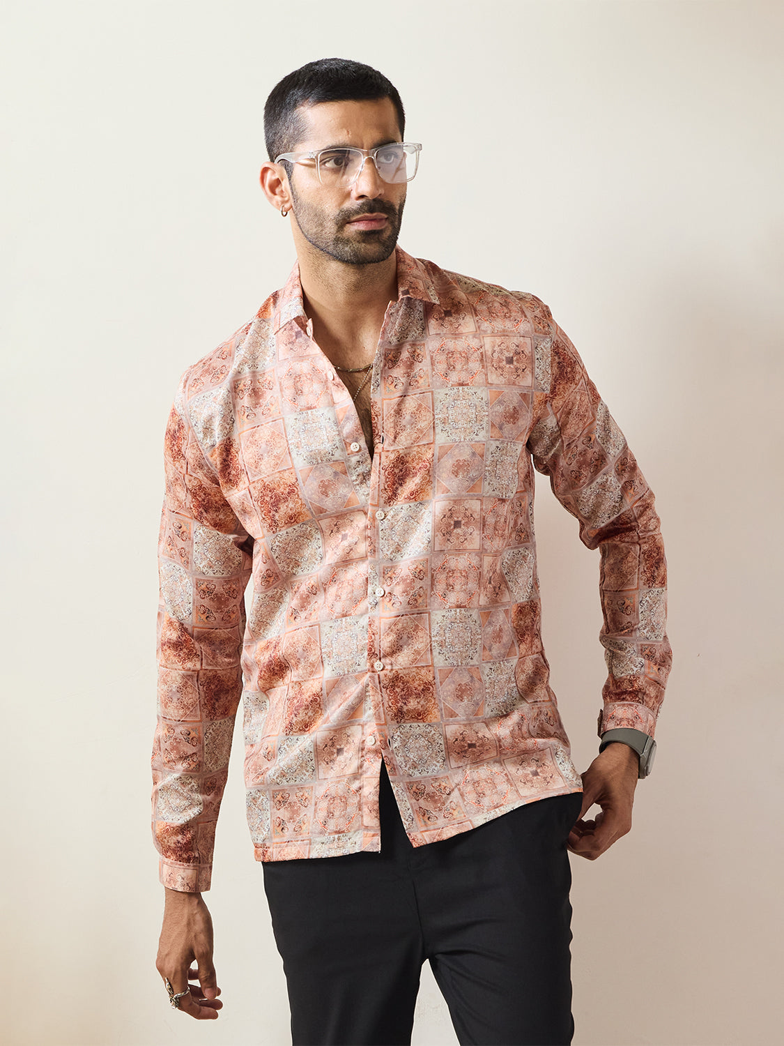 Unveil sophistication with our Beige Printed Shirt, adorned with intricate brickish printing. Crafted from satin muslin in a slim fit design, this full-sleeve shirt radiates smart casual charm. Its unique pattern adds a contemporary edge, perfect for making a statement at any gathering. Embrace urban elegance and elevate your style effortlessly.