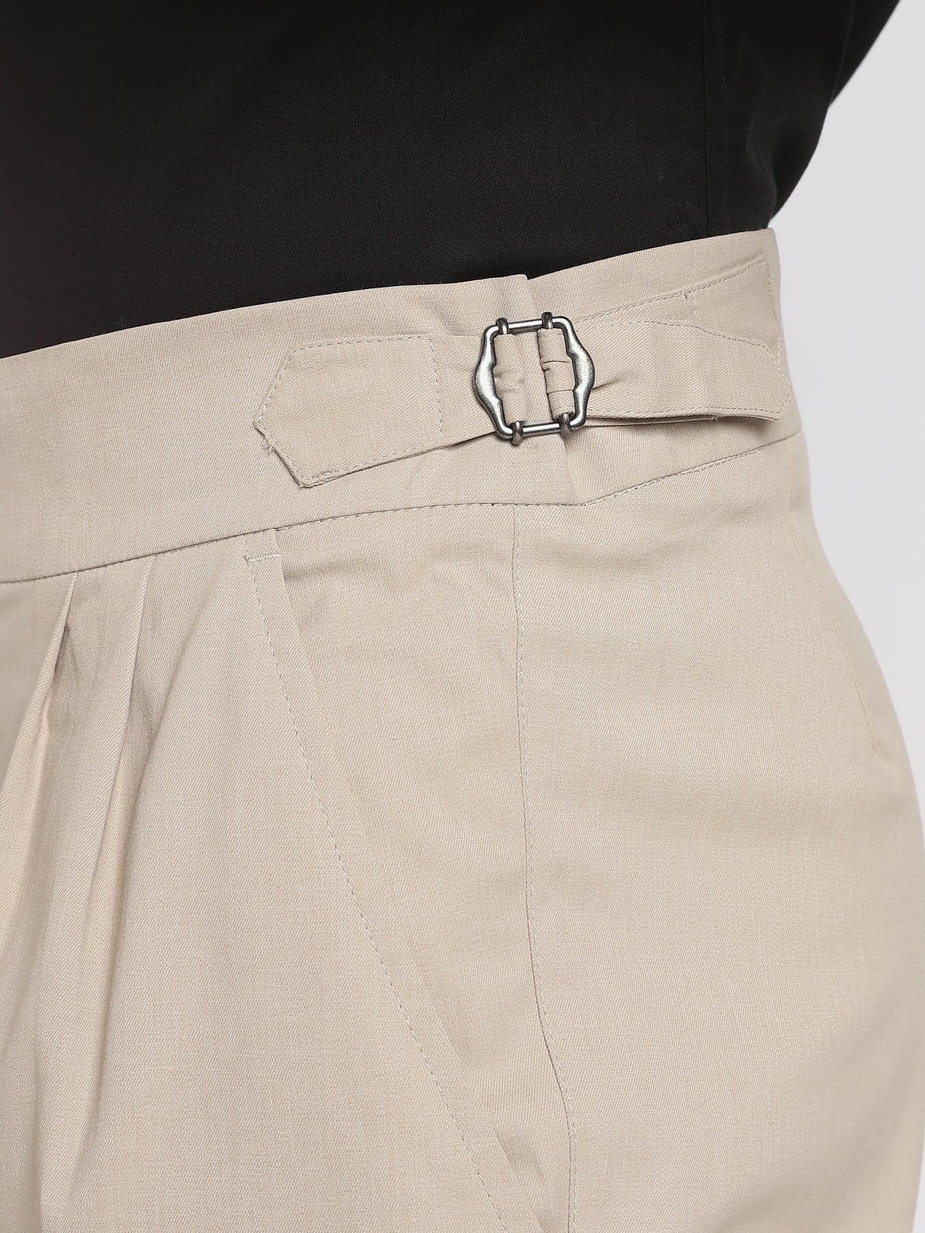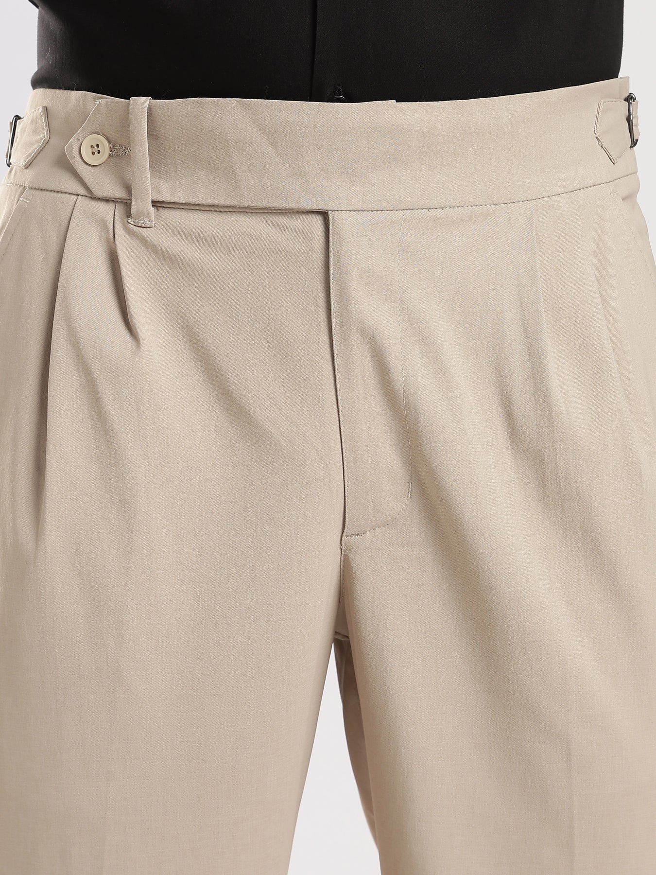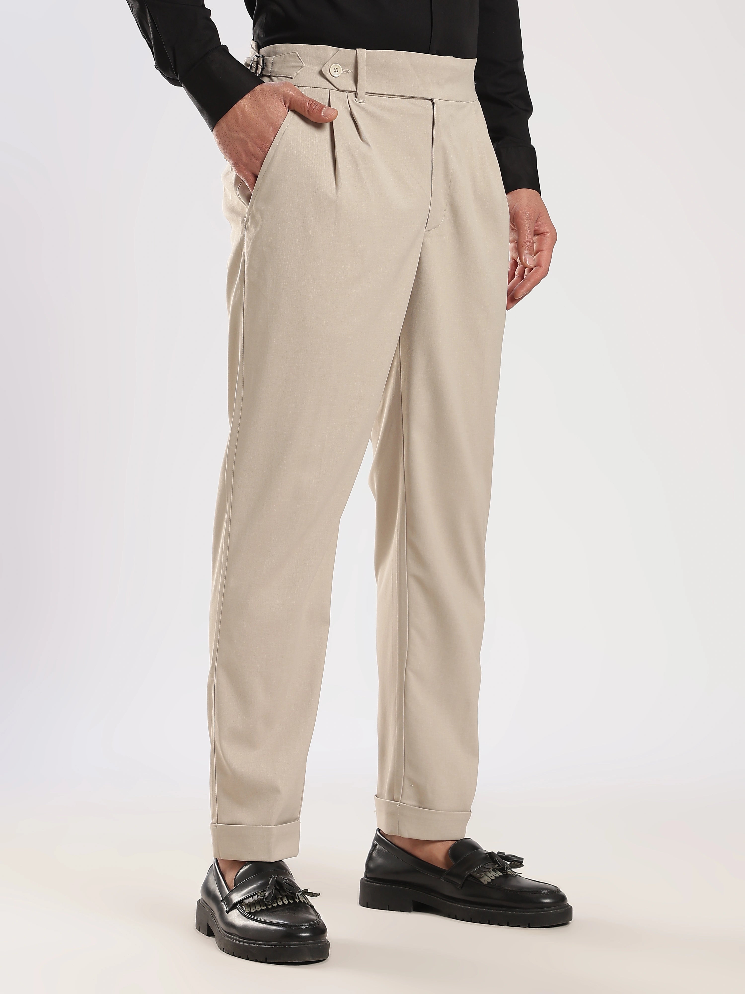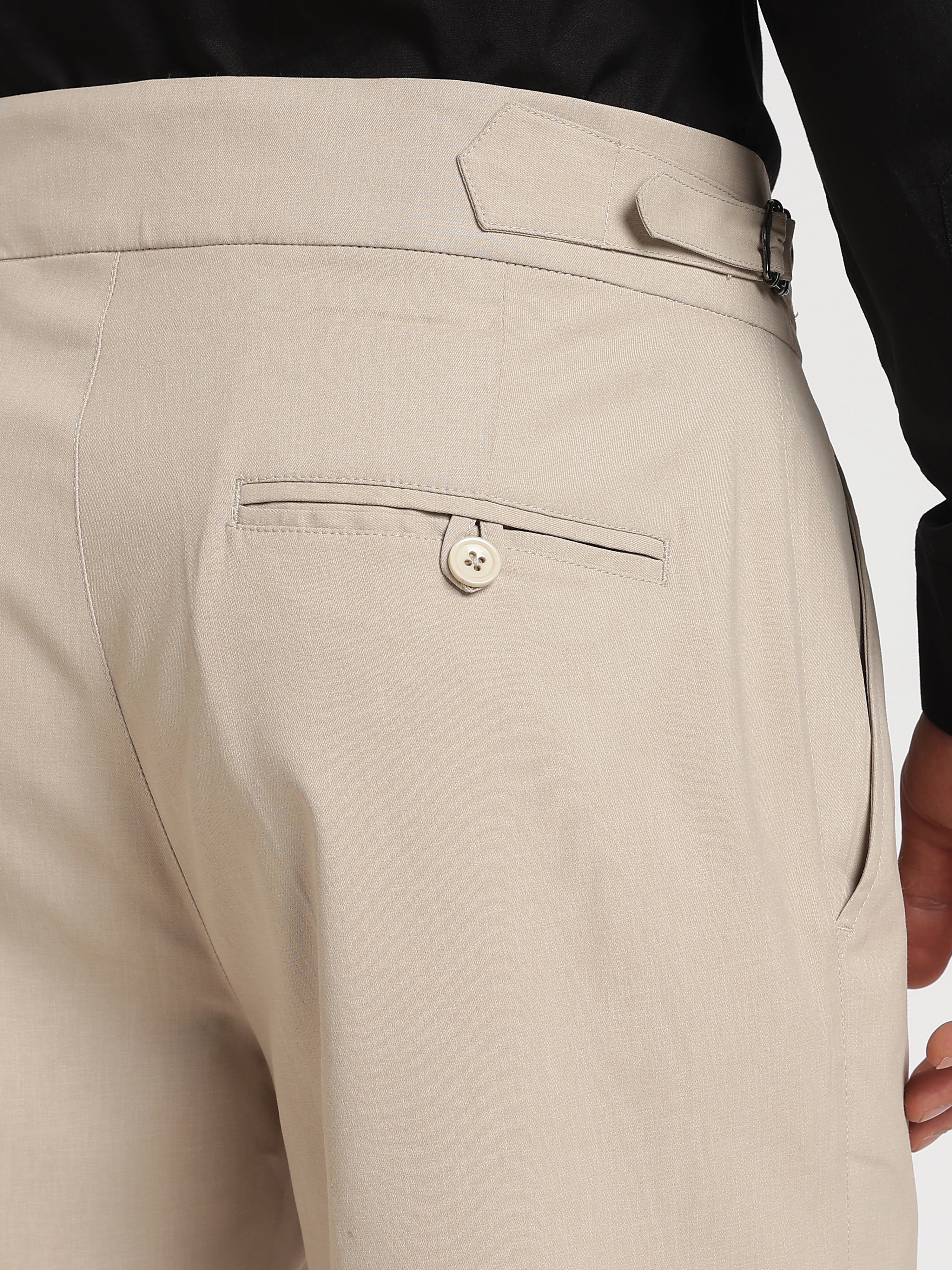 Elevate your wardrobe with our Beige Poly Regular Fit Gurkha Pant Ð a perfect fusion of classic tailoring and modern comfort. Featuring the iconic Gurkha waistband, these pants bring a sophisticated edge to your everyday style.