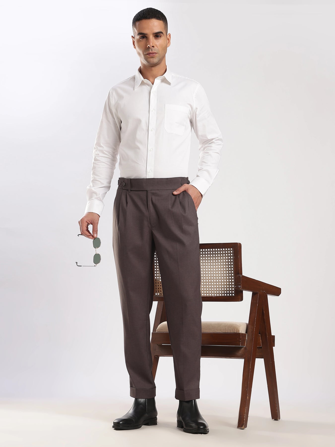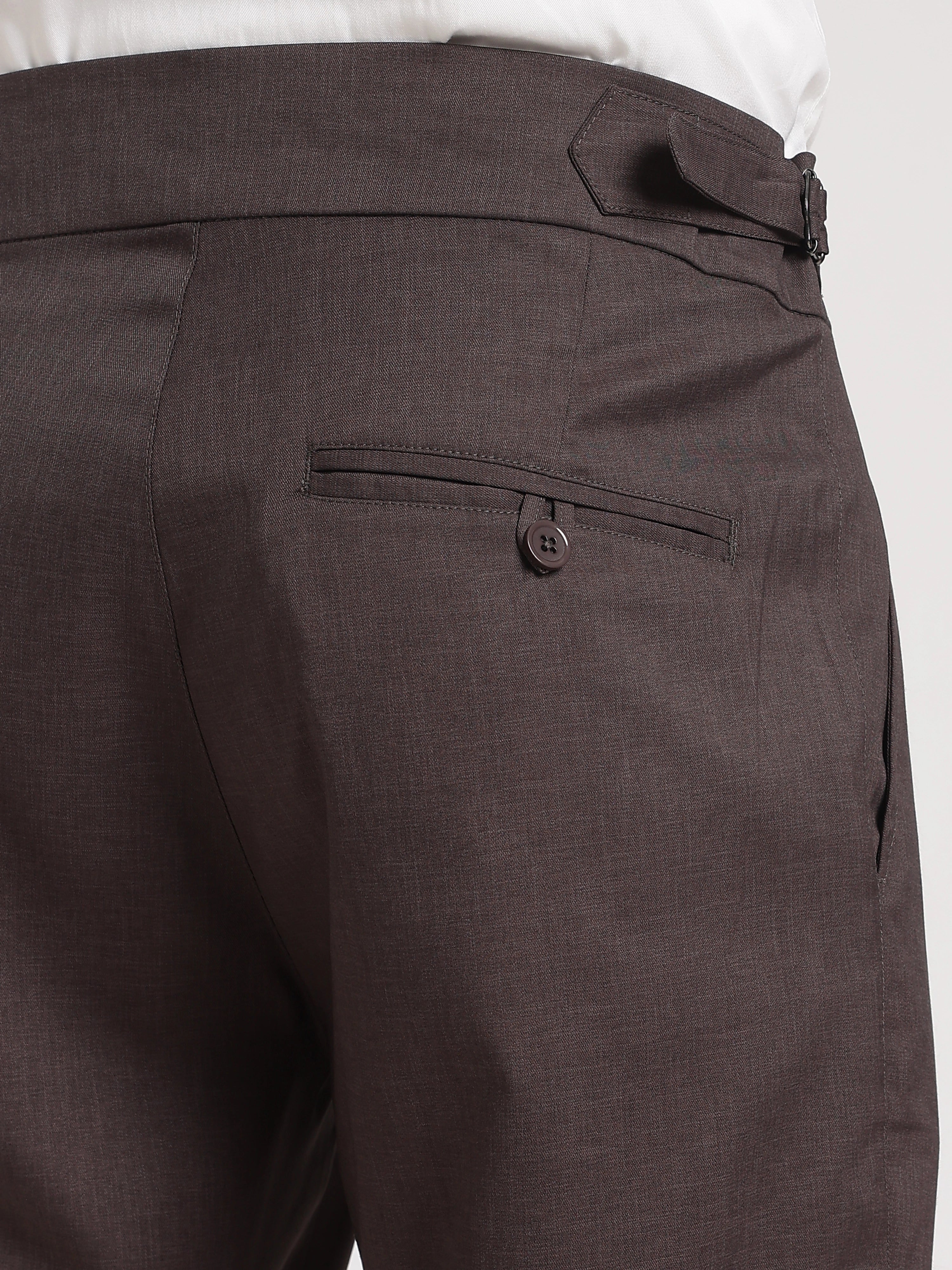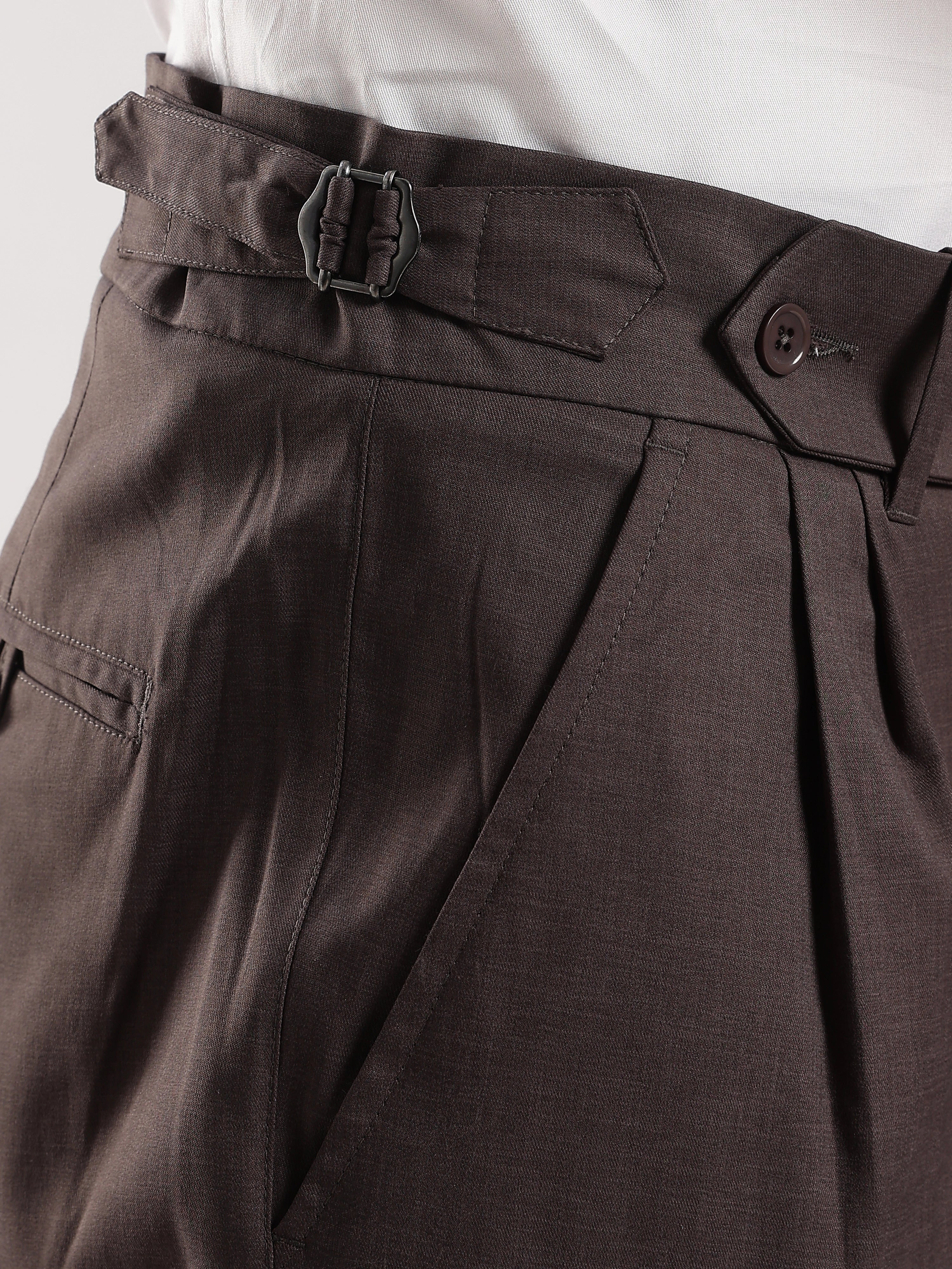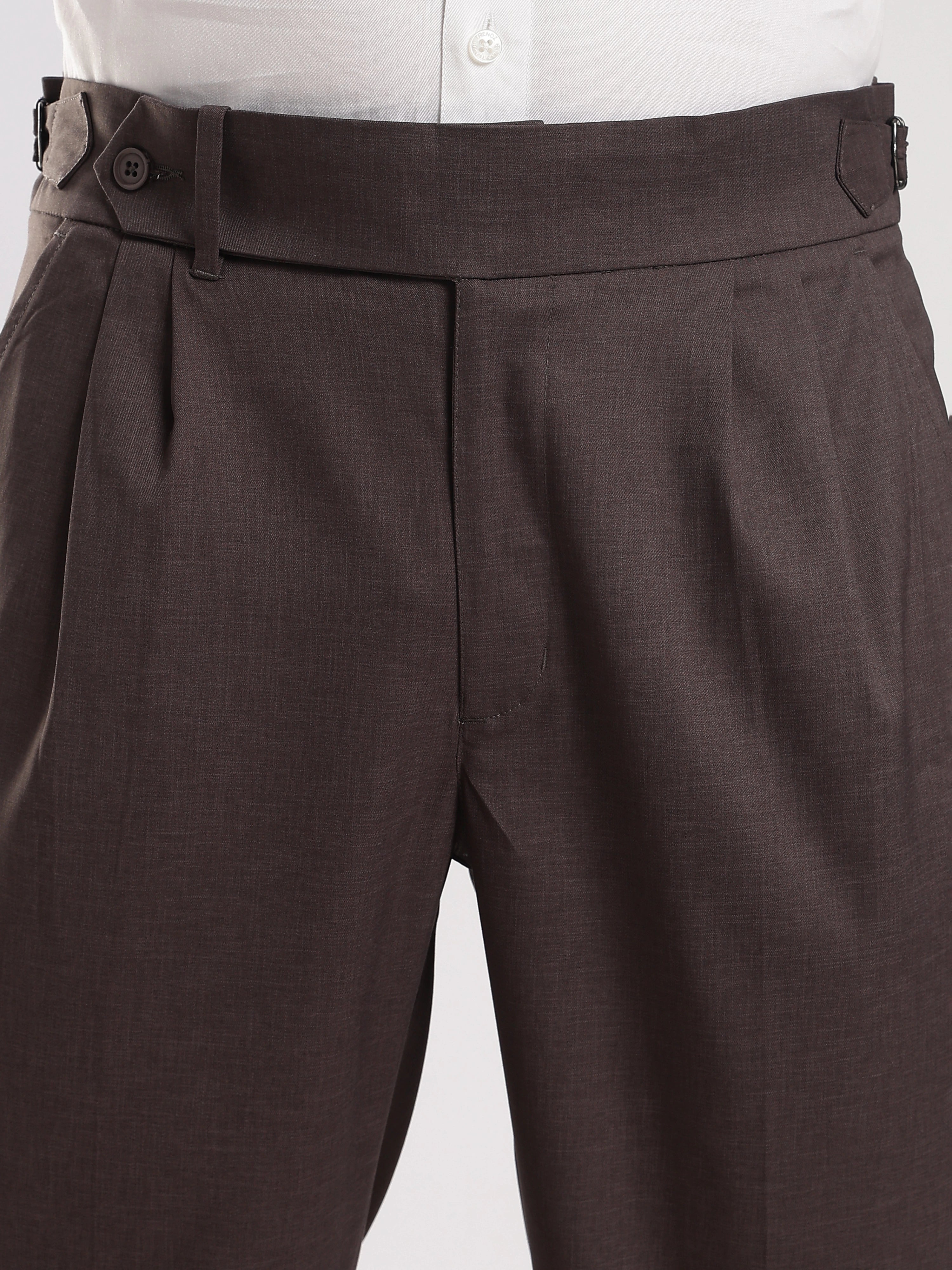 Elevate your wardrobe with our Brown Poly Regular Fit Gurkha Pant Ð a perfect fusion of classic tailoring and modern comfort. Featuring the iconic Gurkha waistband, these pants bring a sophisticated edge to your everyday style.