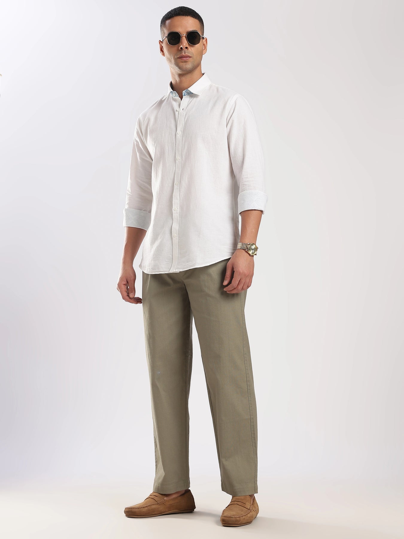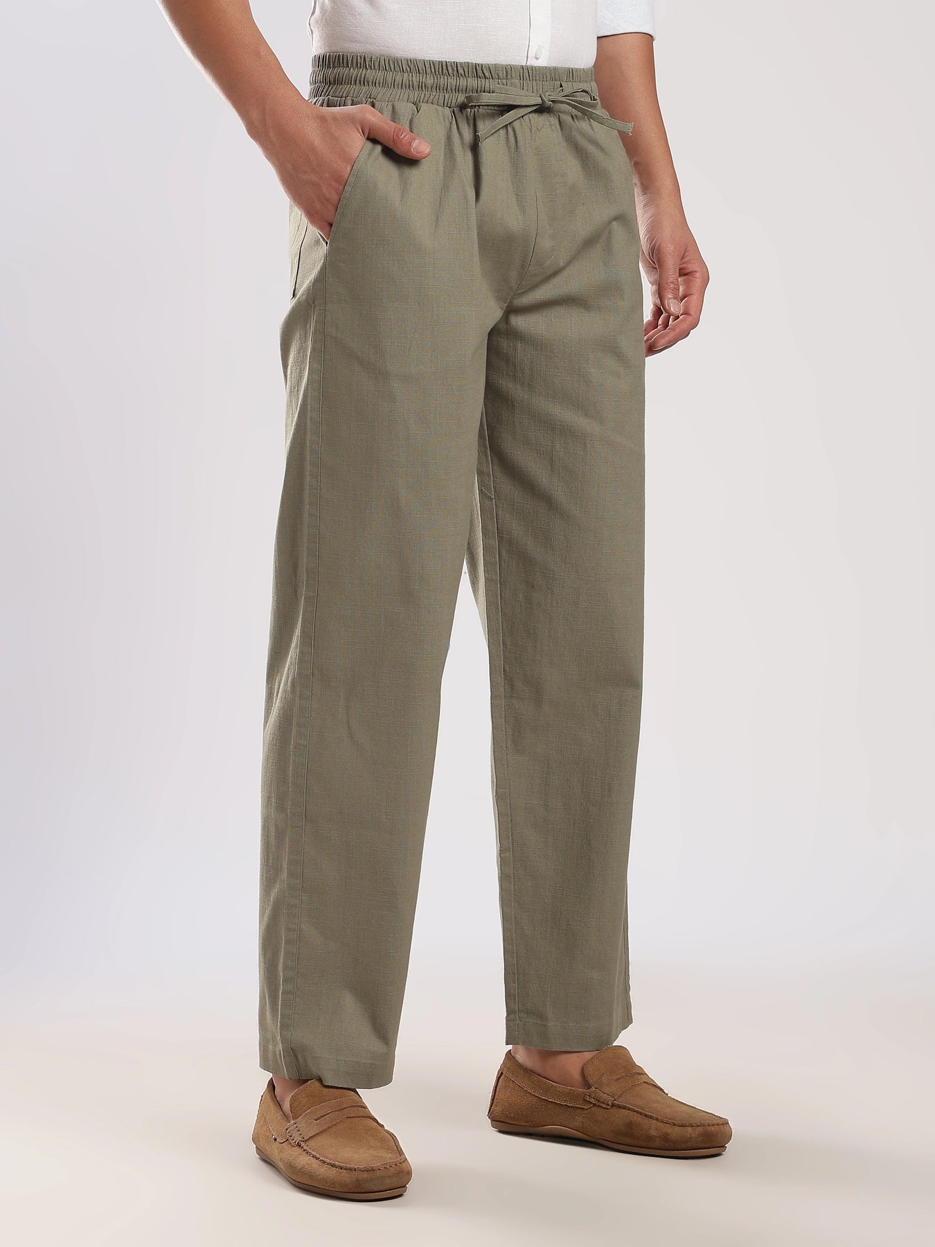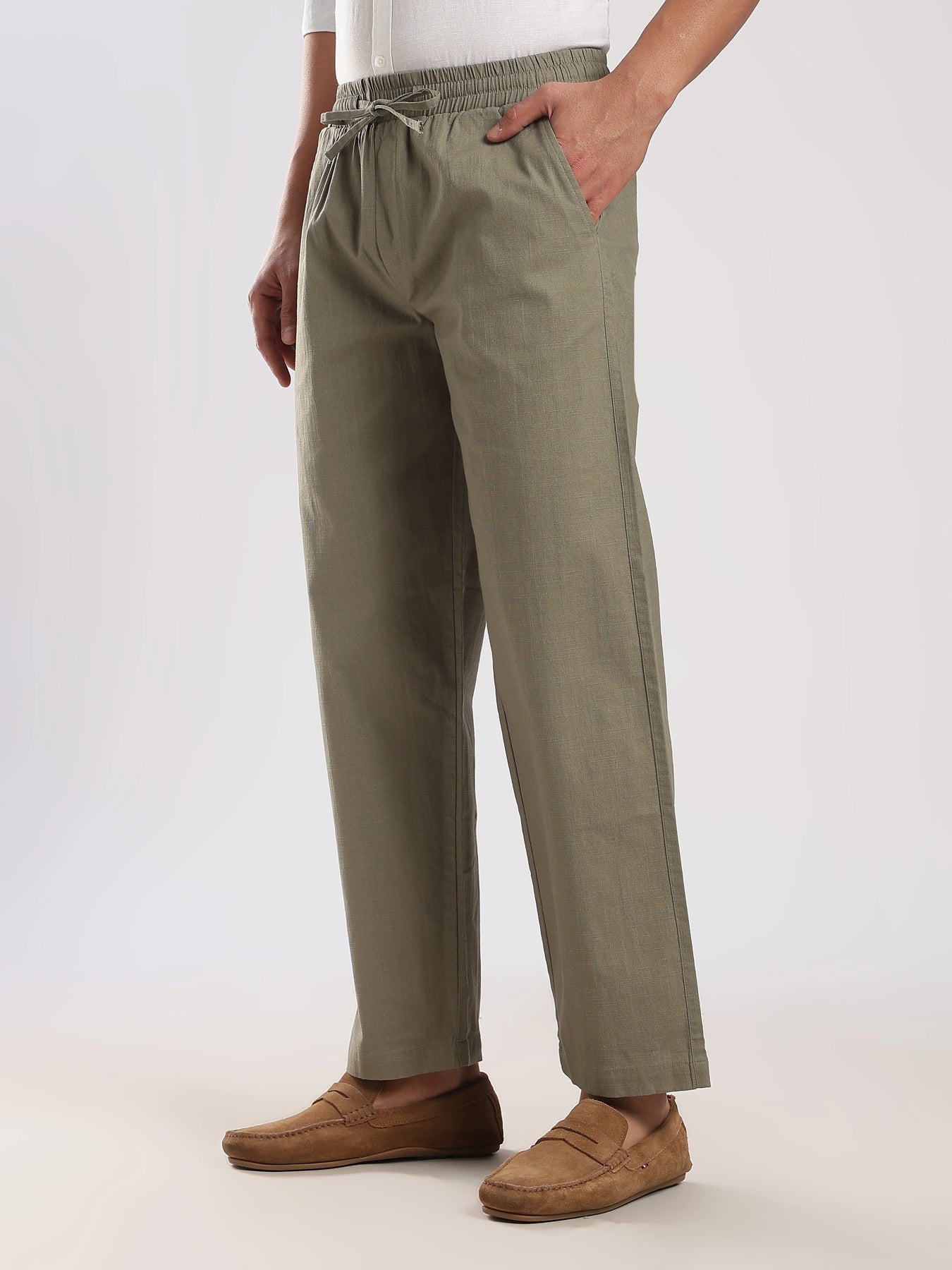 Fit: Regular Fit Ð balanced structure with all-day comfort Color: OLIVE Ð a modern, earthy tone for versatile styling Fabric: Poly-Linen Blend Ð lightweight, breathable & wrinkle-resistant Waist: Mid-rise with a comfortable fit Closure: Button closure with zip fly Pockets: Functional side and back pockets for daily essentials Occasion: Ideal for casual outings, travel, and semi-formal wear Model Info: Model is wearing size 34